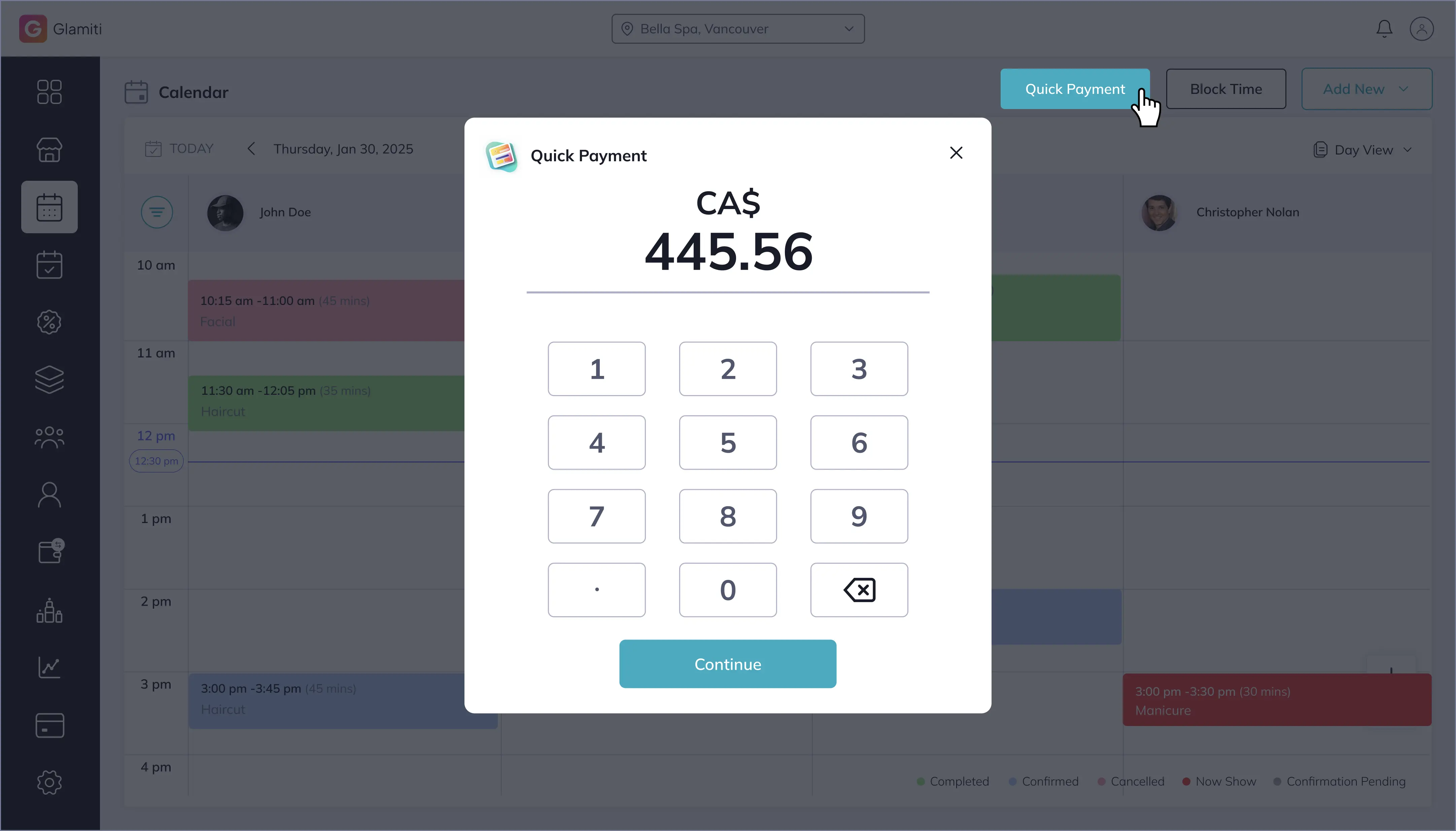 From your Calendar view, select 'Quick Payment' at the top to initiate a rapid checkout flow.
