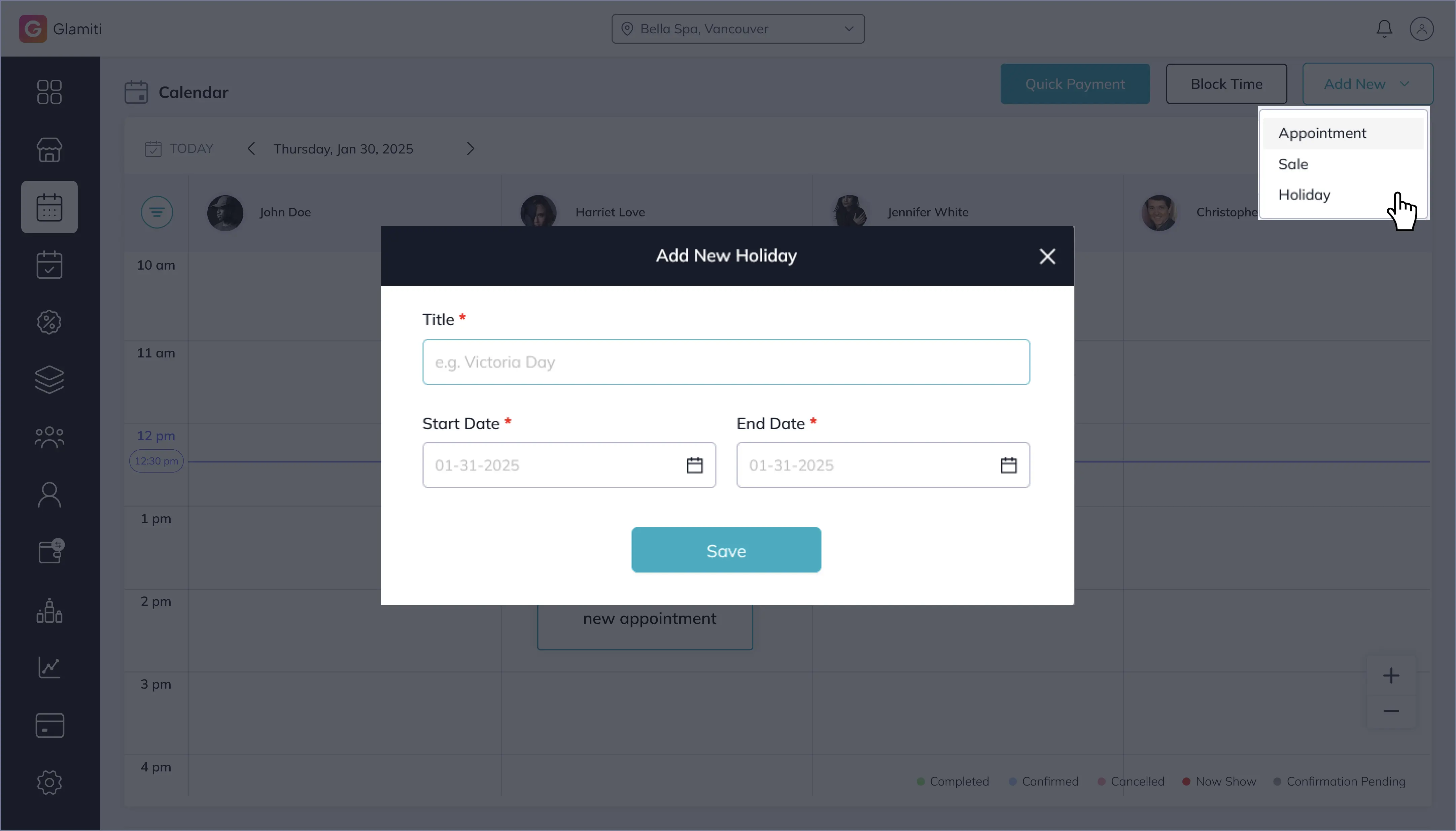 Click "Add New" from the top-right corner of the calendar and select "Holiday".