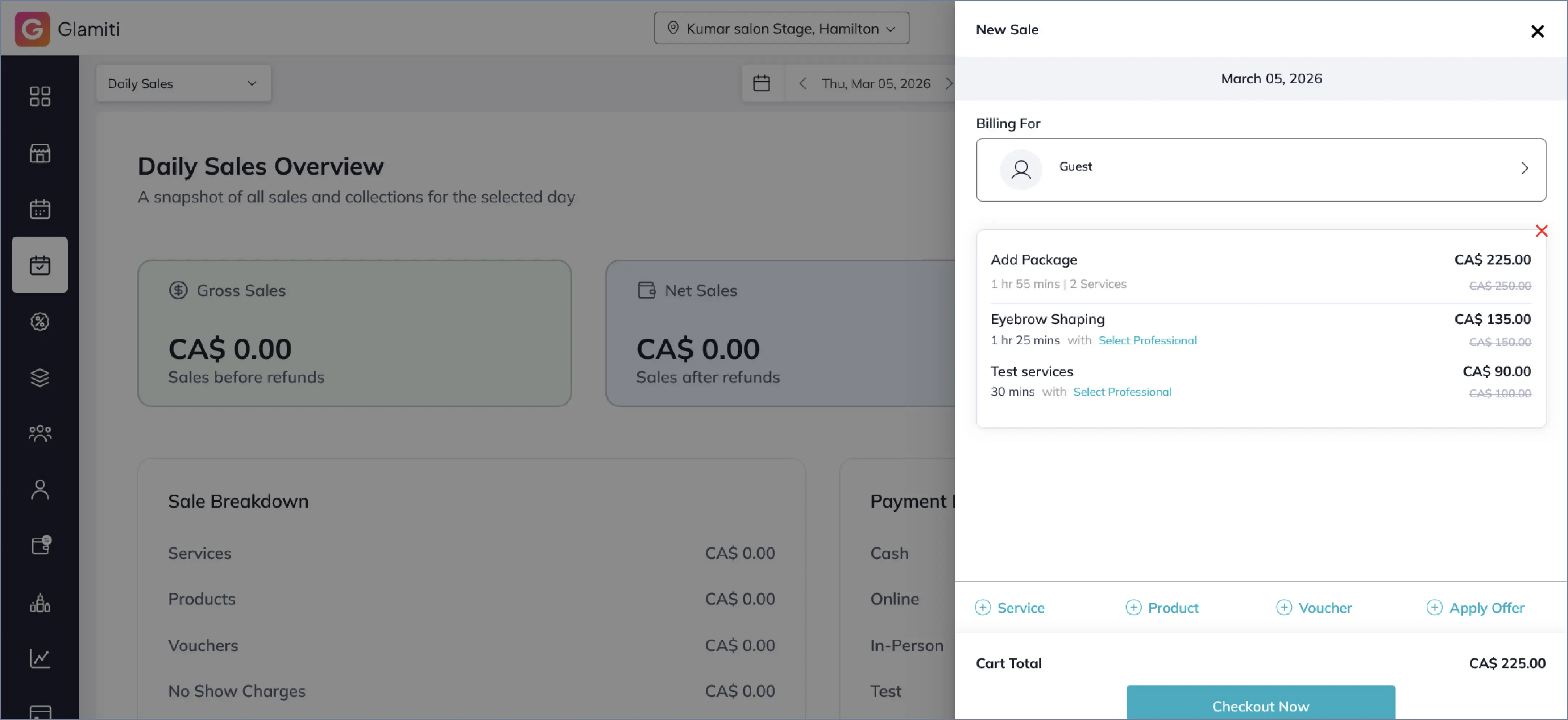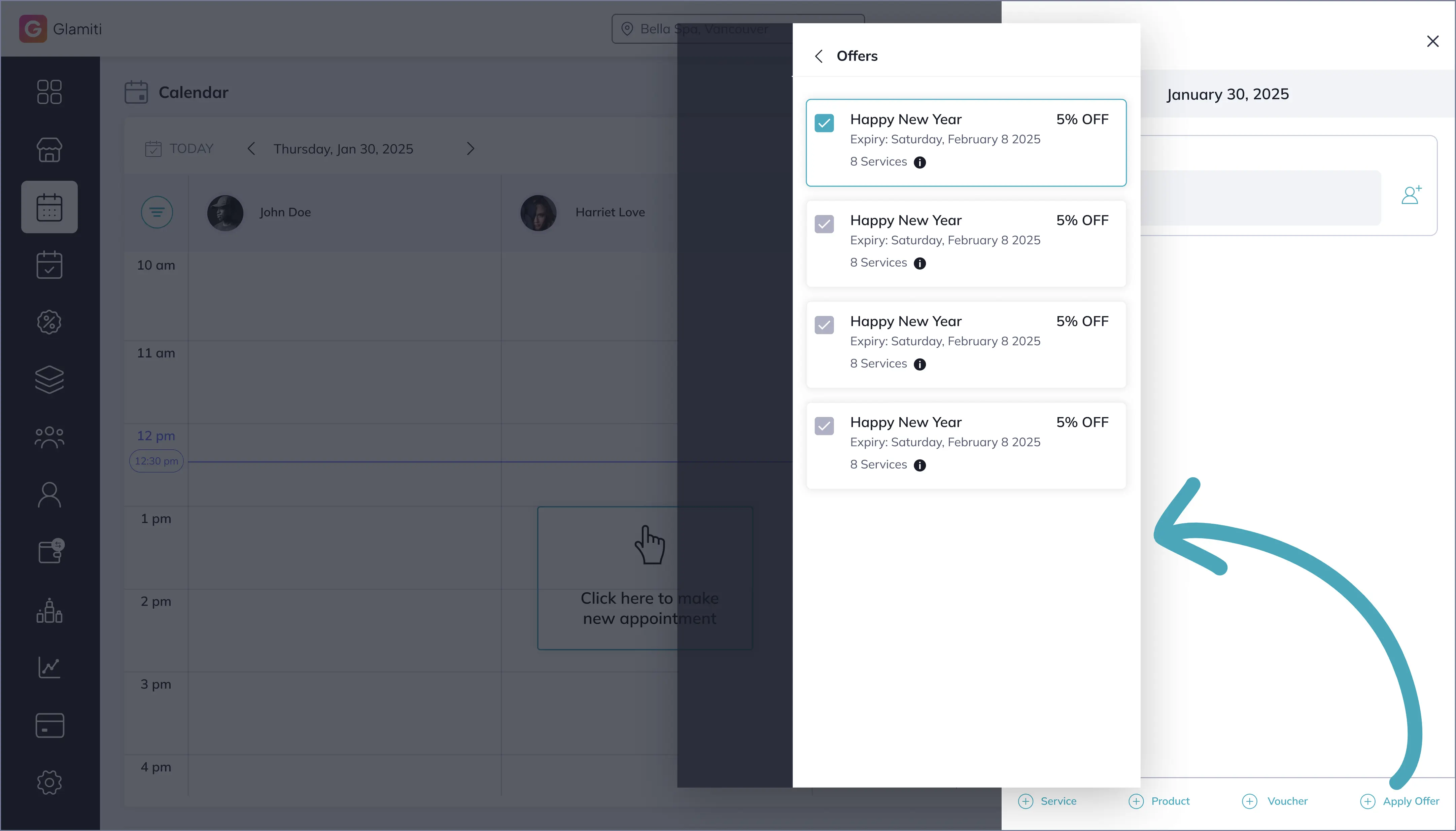 Easily apply discounts to items (services, products, or vouchers) once they're added to the cart. Please note that only one discount can be used per transaction.