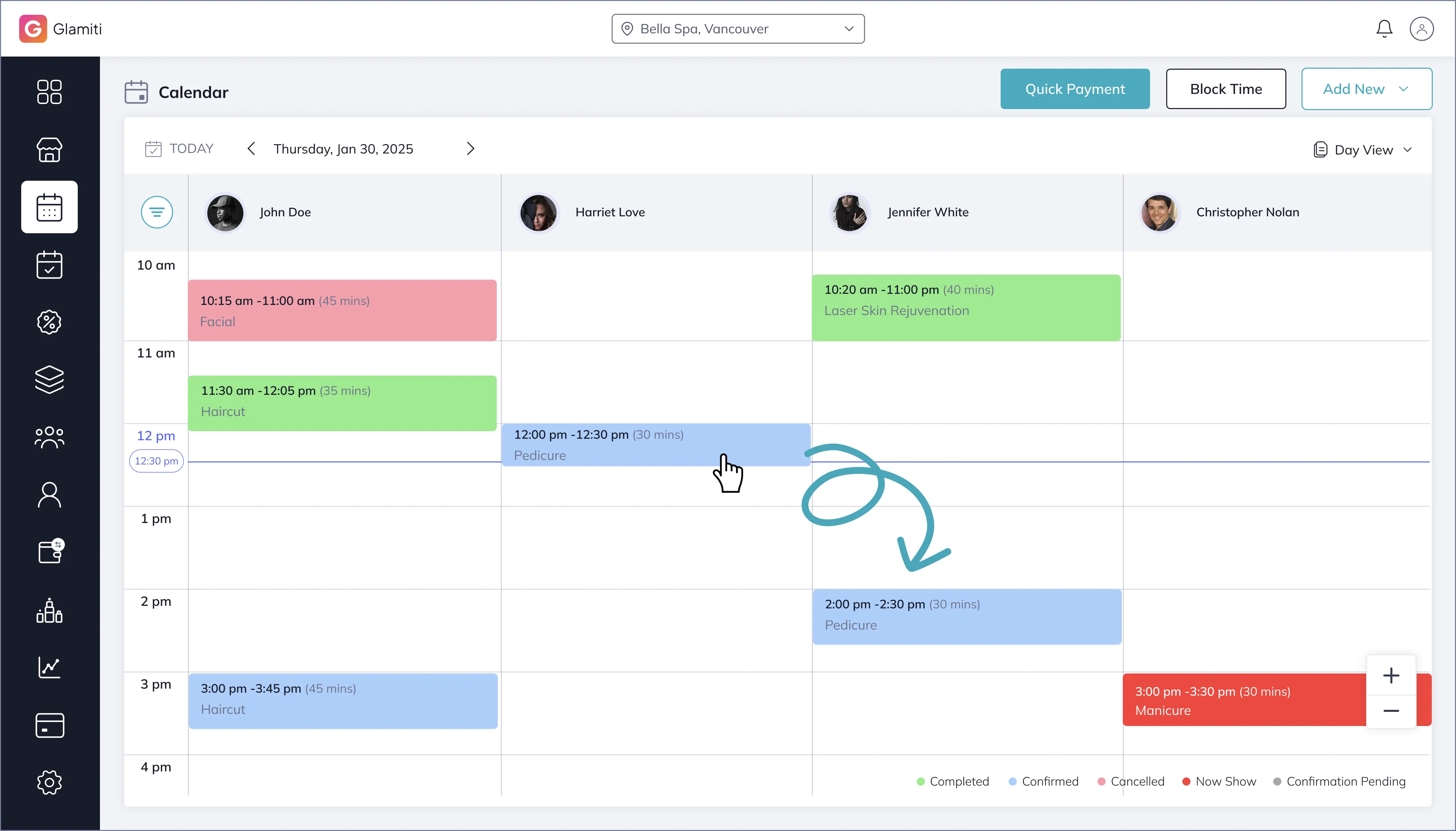Drag a booked service to another professional's time slot to change the assigned professional and time.