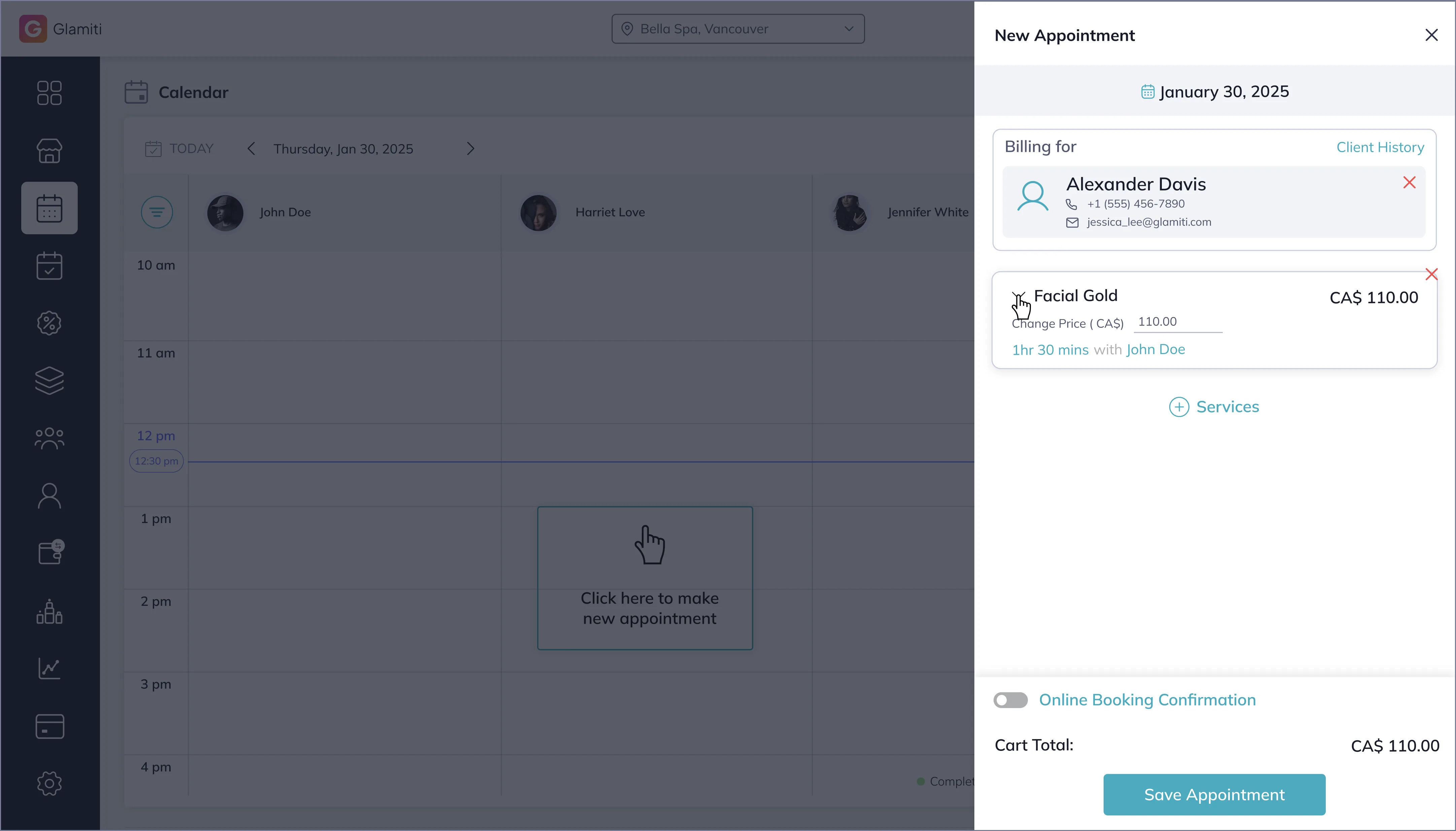 Editing bookings is simple with the drag-and-drop feature, allowing you to change the professional, time, and date of the service. The length of the booking can also be adjusted to increase or decrease booking service duration. The shortcuts offer an efficient and time-saving method for editing bookings.
