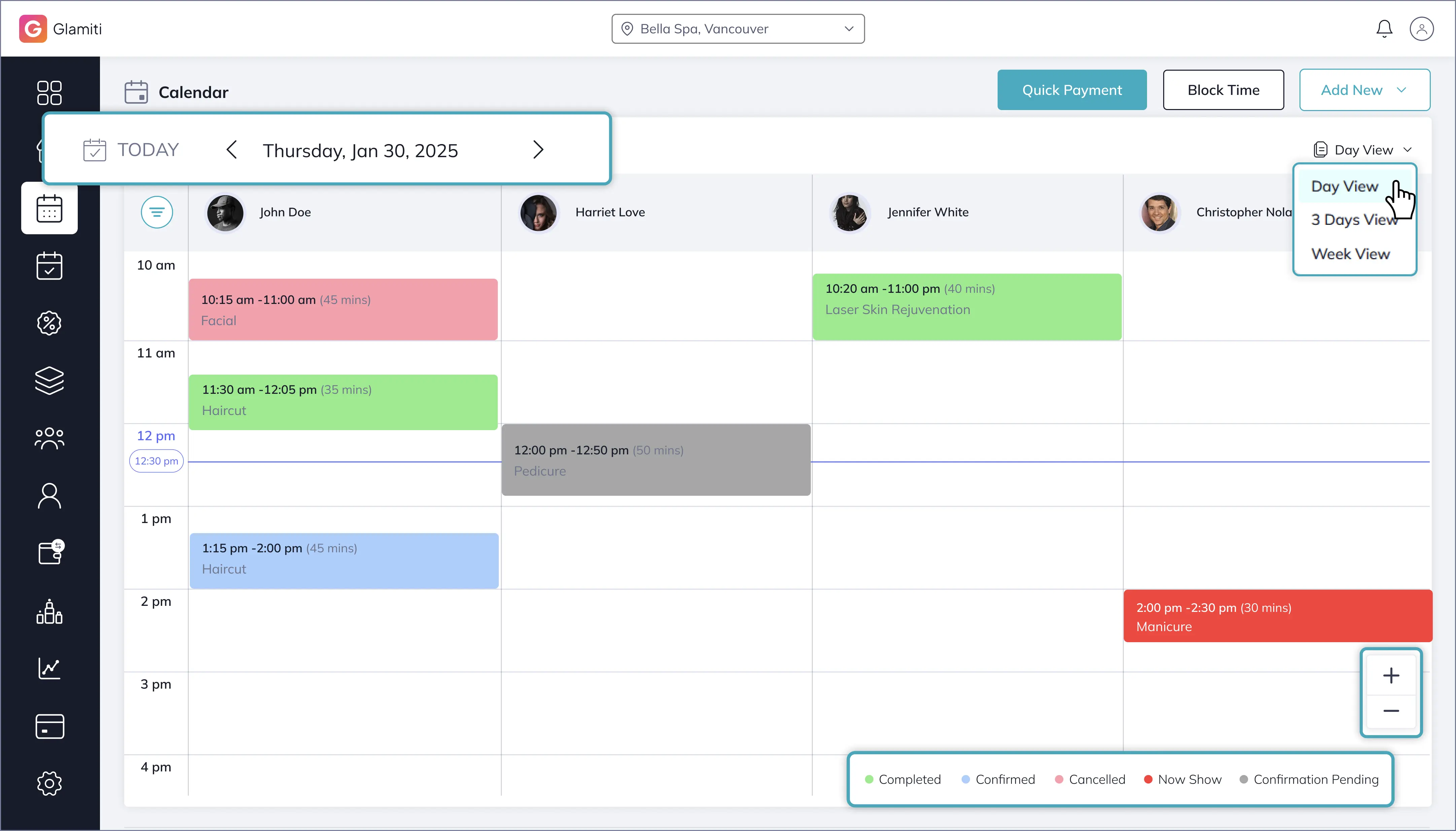 Appointments can be viewed in three different views (Day, 3 Day, Week) for flexible scheduling.