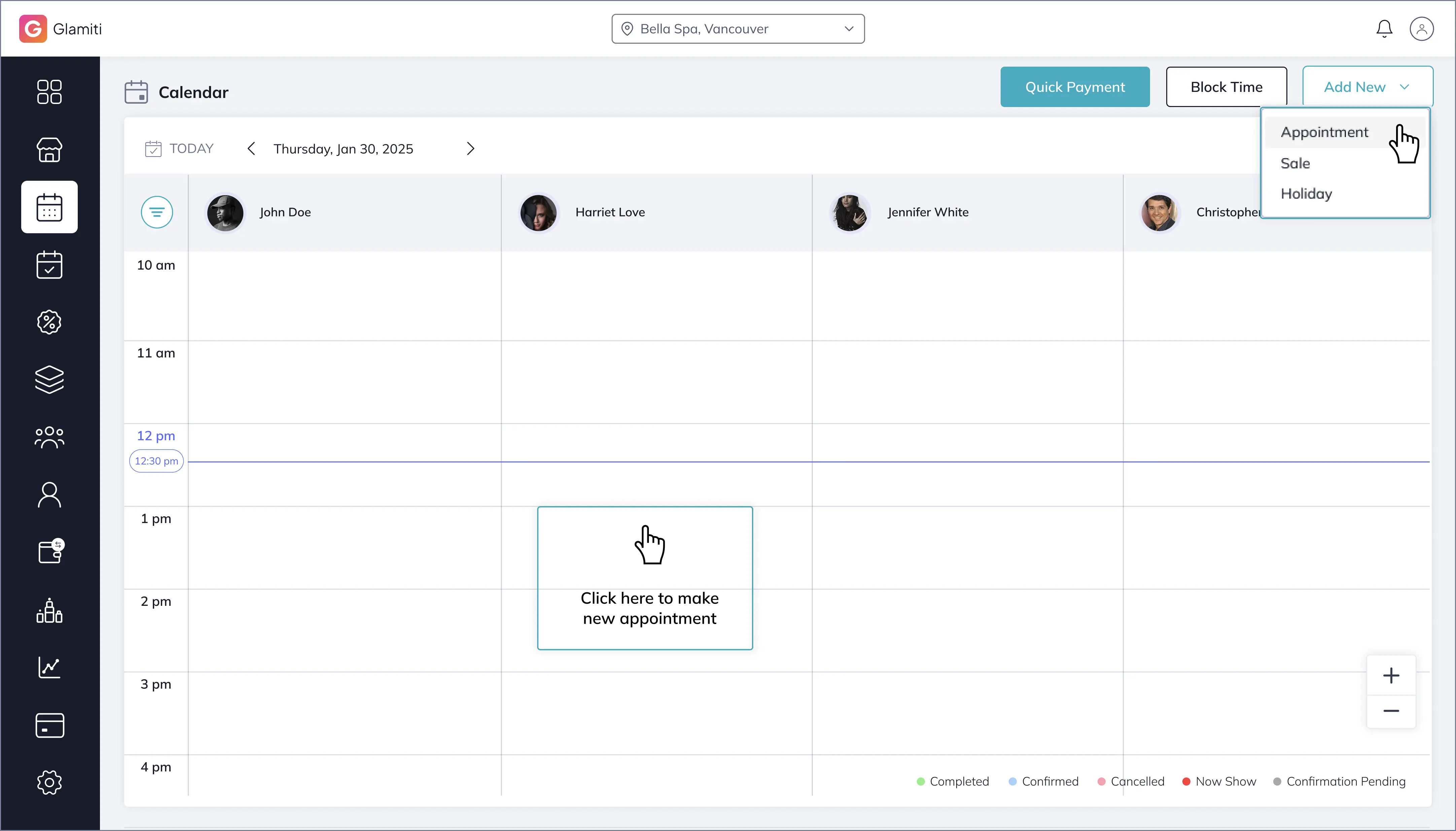 The calendar is the central hub for managing appointments and sales in your business. The user-friendly design of our interface prioritizes simplicity and ease of use. It is easily accessible upon logging into your account and offers various navigation options.