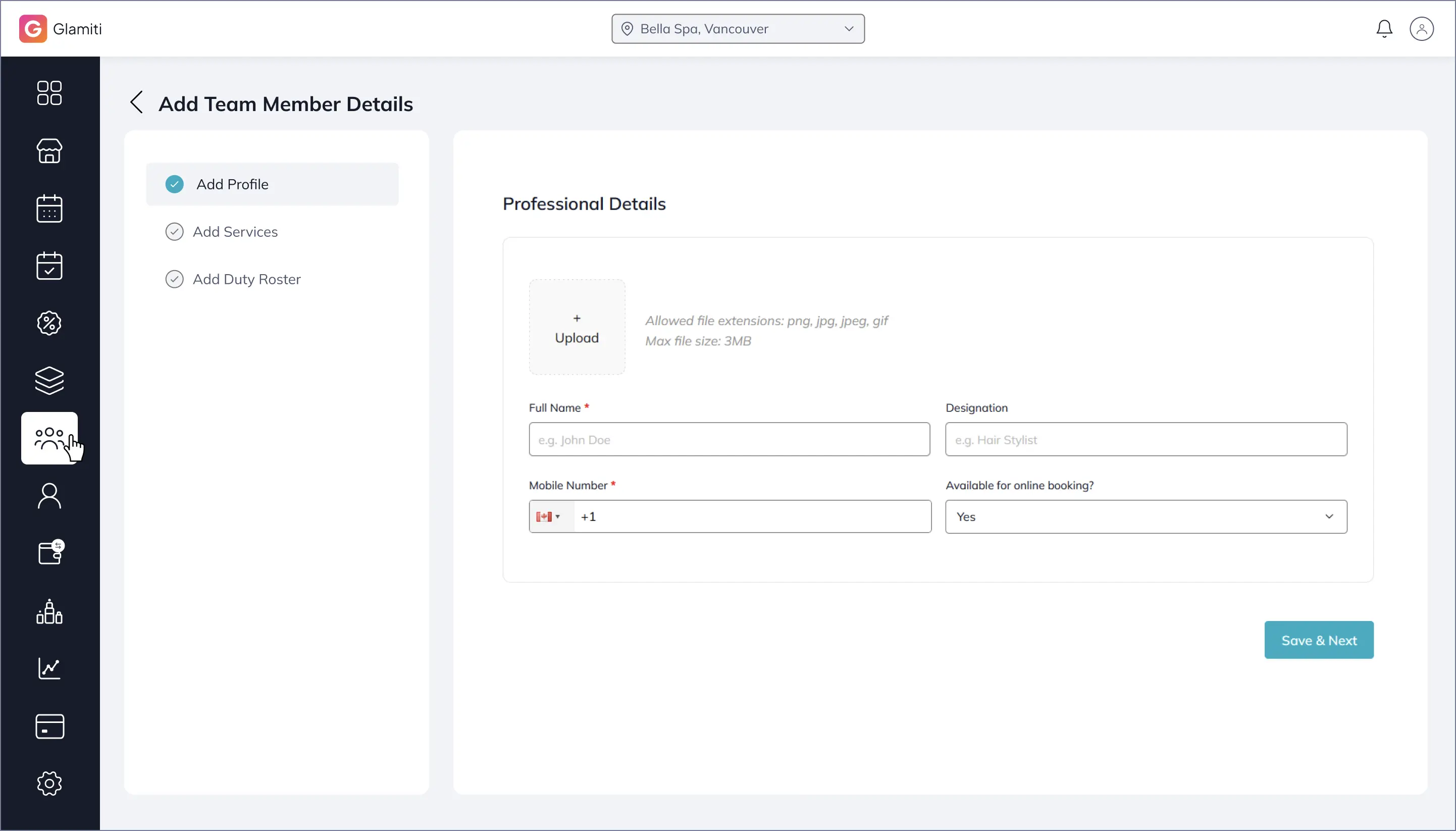 Duty rosters for team members are managed separately after adding professionals.