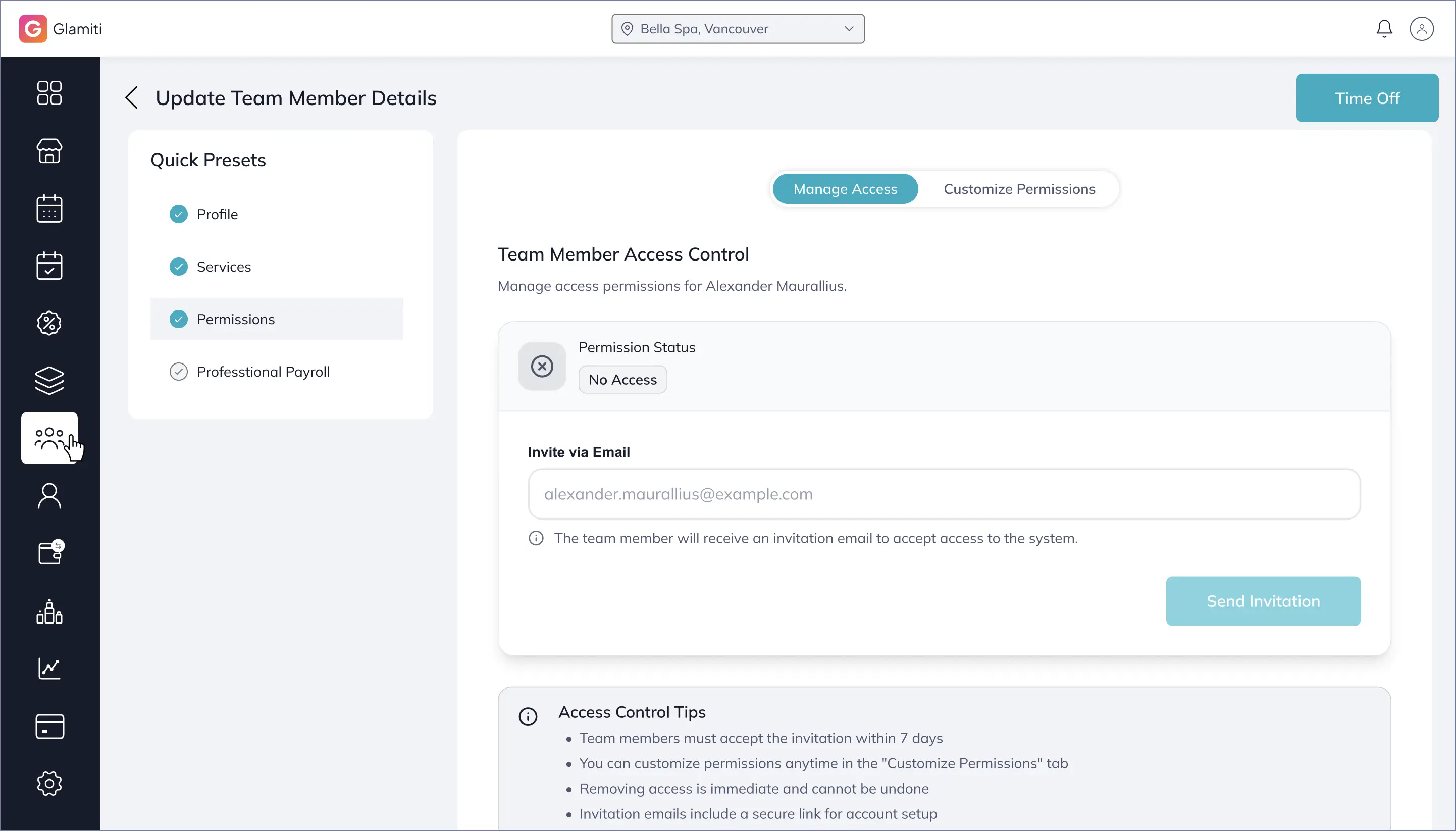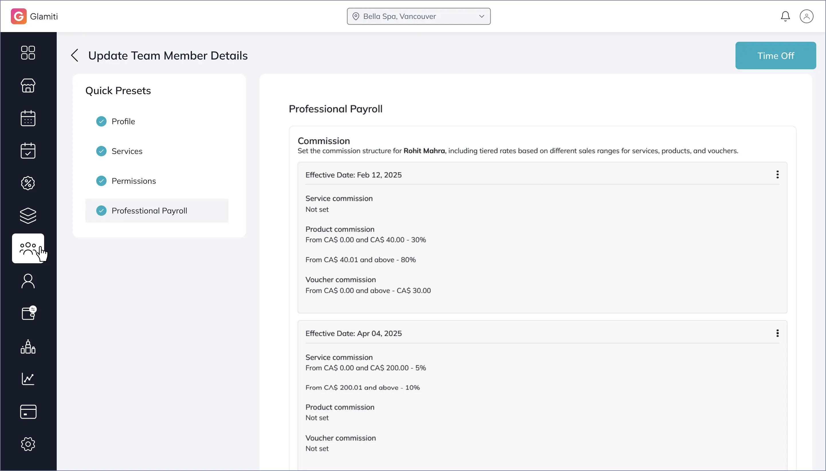 Add professionals, assign permissions, and manage schedules and payroll settings.