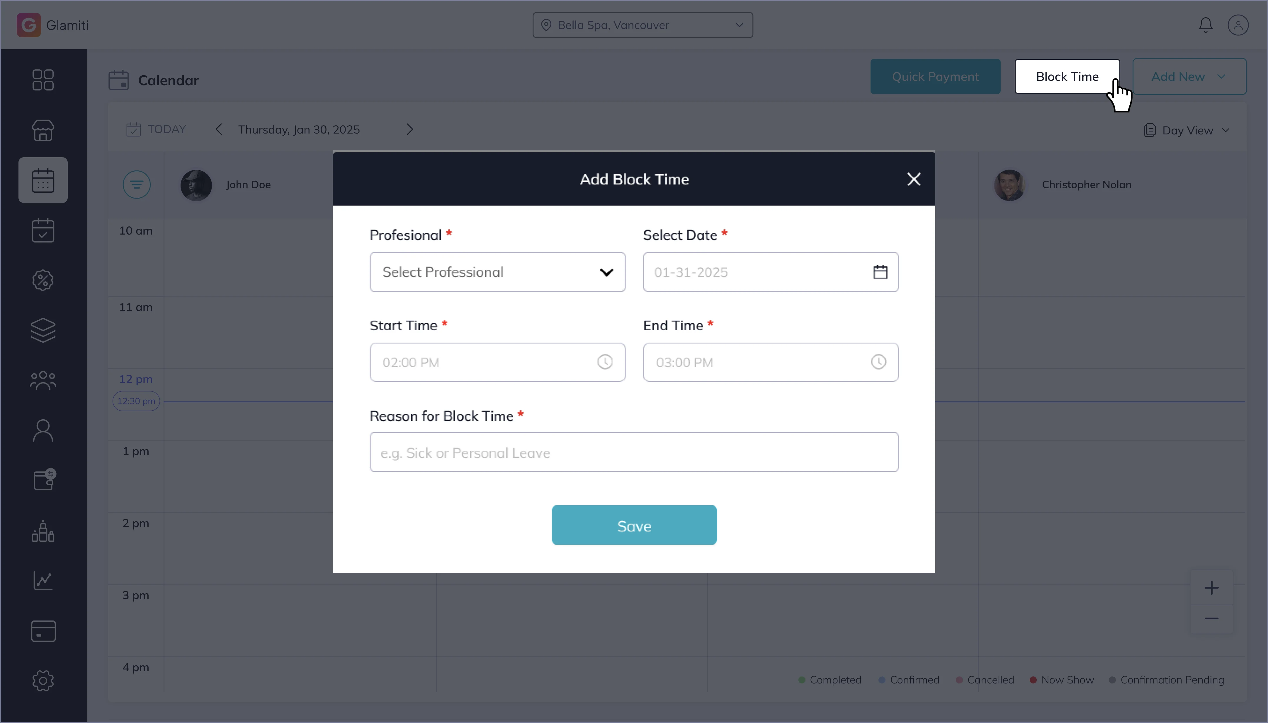 Editing bookings is simple with the drag-and-drop feature, allowing you to change the professional, time, and date of the service. The length of the booking can also be adjusted to increase or decrease booking service duration. The shortcuts offer an efficient and time-saving method for editing bookings.