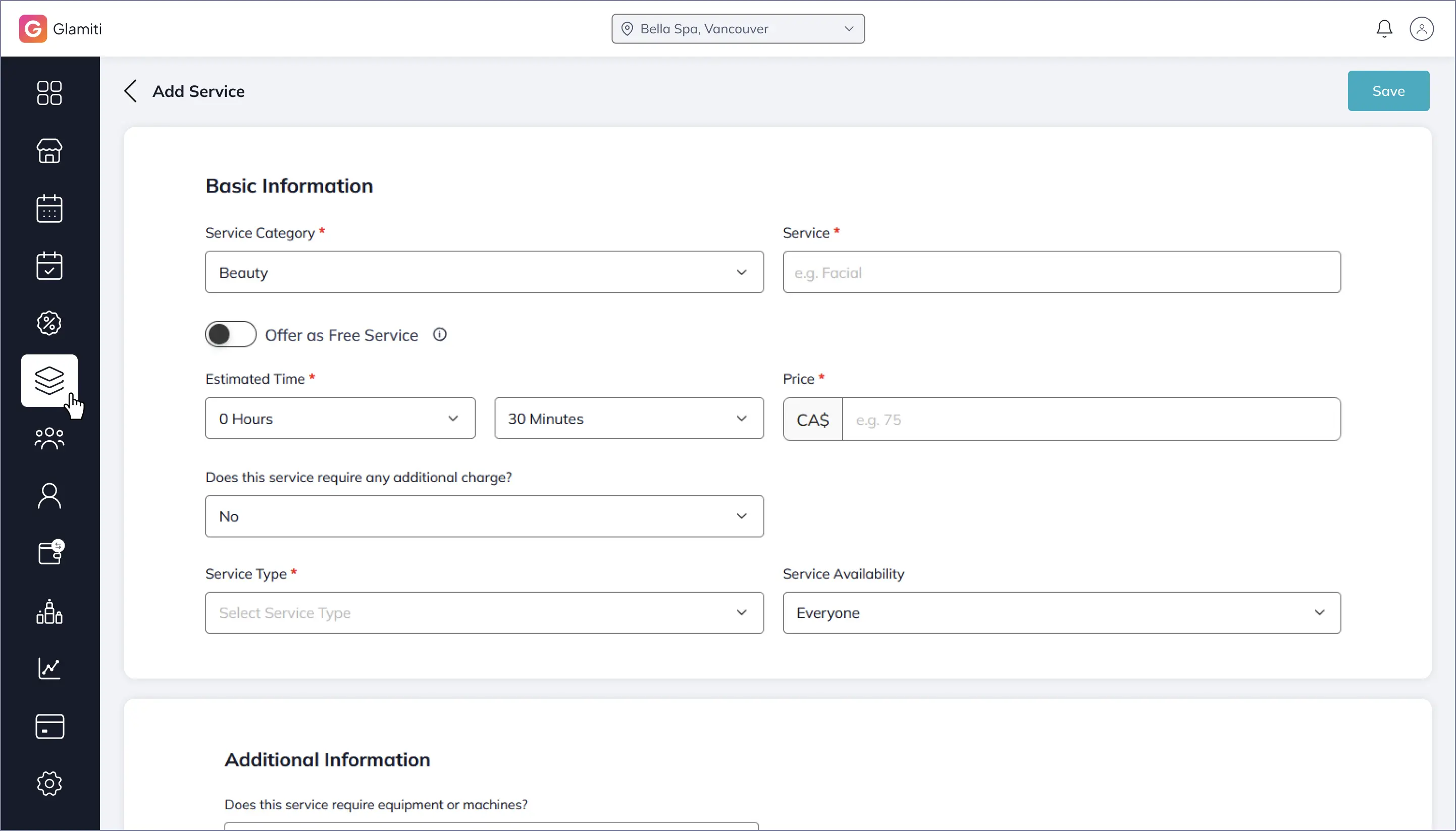 Once you have added a service category, you can proceed to add services. (It is recommended to first add/import professionals before adding or importing services.)