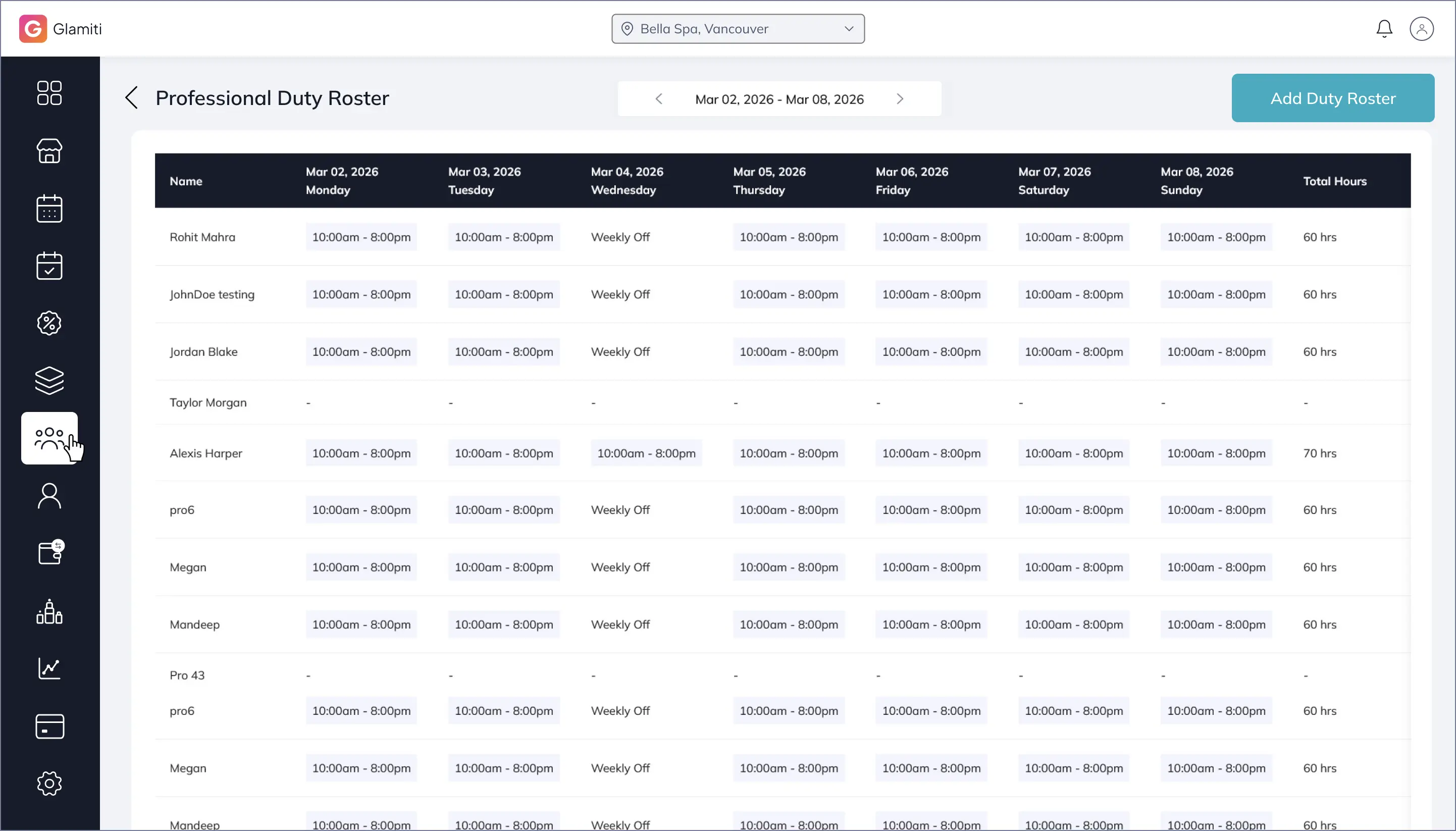 Duty rosters for team members are managed separately after adding professionals.