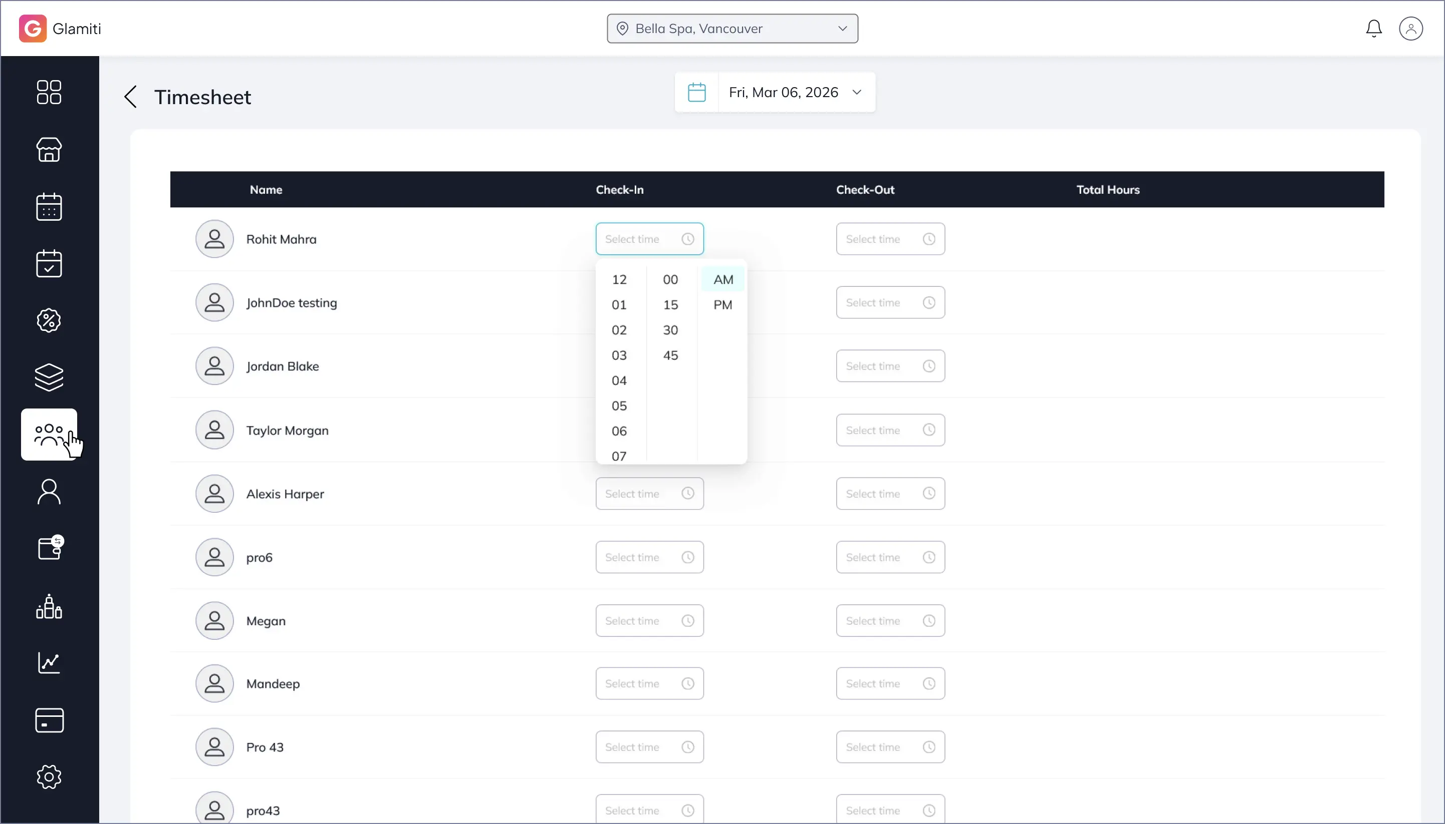 Add professionals, assign permissions, and manage schedules and payroll settings.